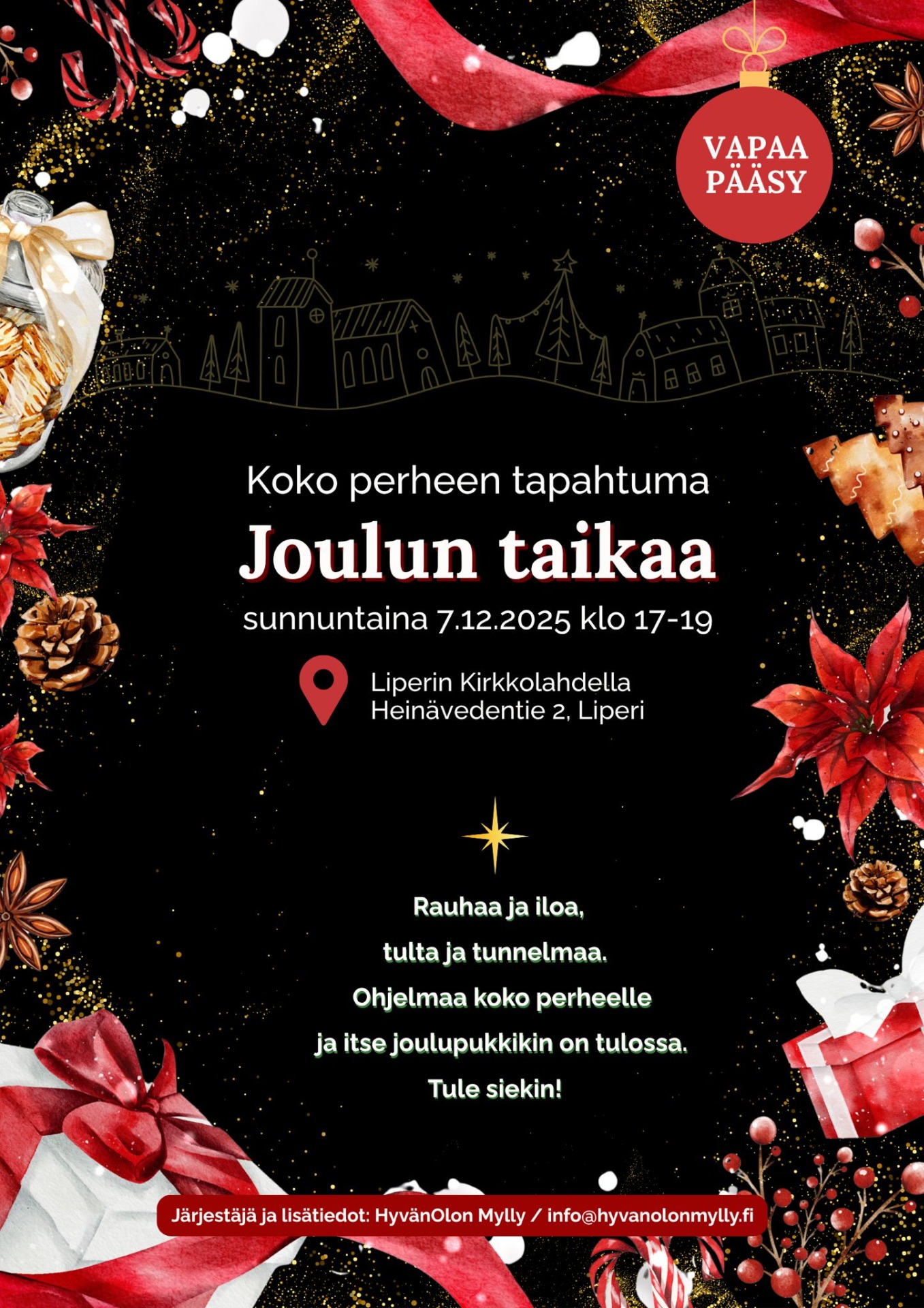 Ohjelmaaa on koko perheelle. Jouluista musiikkia, myyjäiset ja arpajaiset. Tonttukahvilasta nokipannukahvia, kuumia juomia, leivonnaisia ja grillimakkaraa.